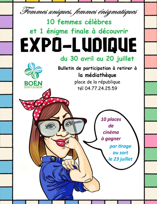 Grâce aux énigmes des panneaux disséminés sur 5 lieux en ville, puis tous rassemblés à la médiathèque du 02 au 20 juillet, devinez 10 noms de femmes célèbres. Ces 10 réponses vous aideront à décoder la citation finale présente sur le dernier panneau de l’exposition.